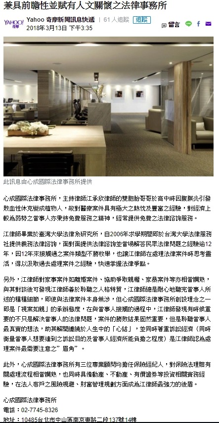 恭喜本所所長江承欣律師獲選為『105年1-3月台北律師公會參與台北市政府法律諮詢服務表現優良會員』
